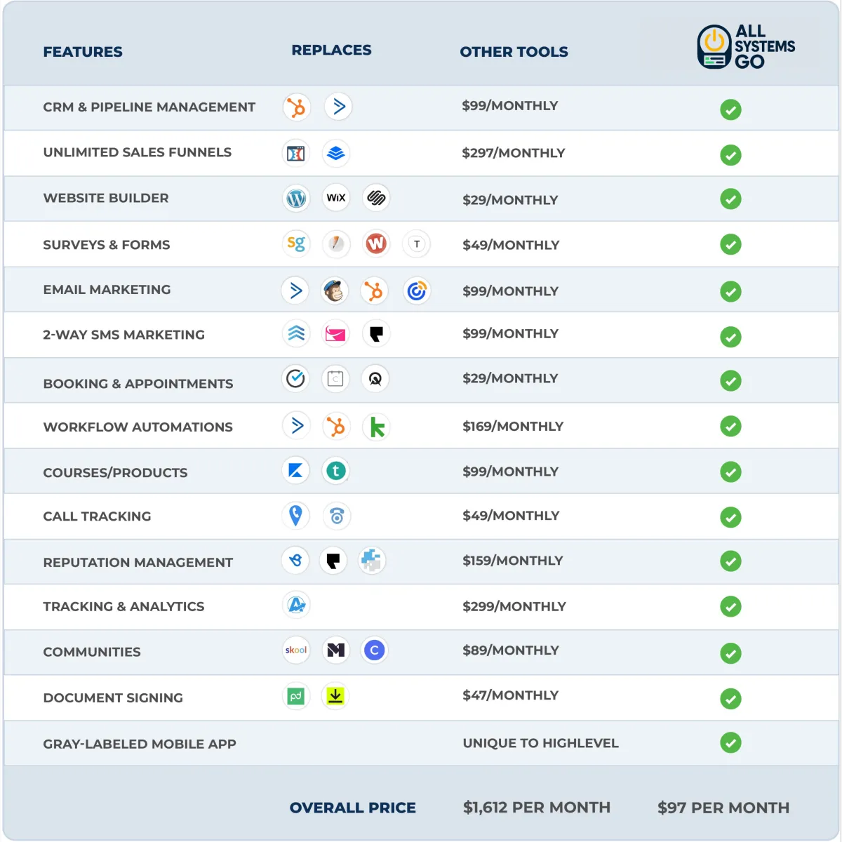 The All Systems Go Platform is everything that marketers need to manage their leads, websites, funnels, calendars and many other services that are needed to maintain a customer.